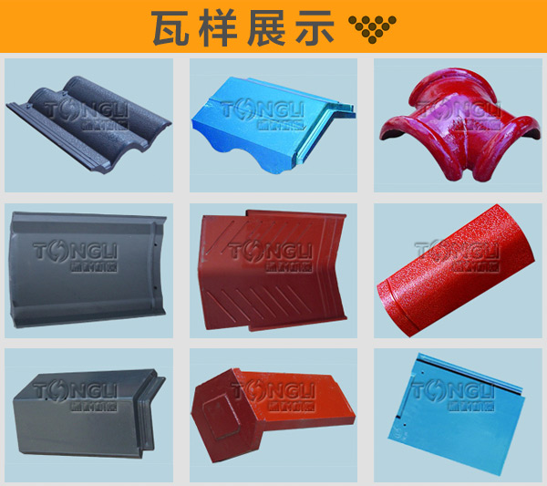 河南通利機器制造公司所生產的模壓水泥彩瓦機造型新穎、搭接合理、有效面積、安裝牢固、施工簡單。是在嚴格執行建材行業標準,具有強度、隔熱性強、抗凍性能、耐酸堿、不剝落、防滲防漏、色澤鮮艷等特點。是公寓、別墅、民宅等屋頂材料的產品。